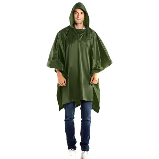 Doskonałe poncho przeciwdeszczowe z daszkiem. Idealna ochrona przed deszczem. Obszerny kaptur z daszkiem ochroni Cię przed zacinającym deszczem.