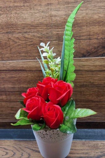 Bukiet z różami i innymi kwiatami mydlanymi to idealny prezent dla bliskiej osoby lub piękna ozdoba dla Twojego domu lub biura.
