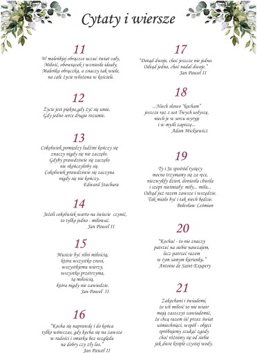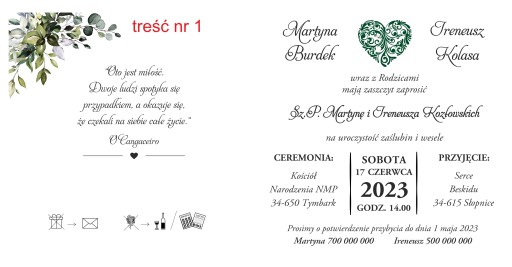 - W cenie zaproszenia wydrukowane jest w którym kościółku, gdzie przyjęcie, cytat, Pełna personalizacja Gości weselnych lub puste pole do uzupełnienia oraz grafiki do wyboru co zamiast kwiatów lub prezentów.