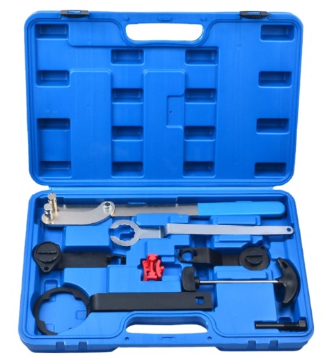 W zestawie znajduje się m.in. blokada wału korbowego, koła zębatego rozrządu, napinacz koła pasowego, trzpień do wału, narzędzie do blokowania koła zębatego wałka rozrządu