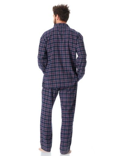 Piżama męska z naturalnej bawełnianej flaneli, we wzorze w granatową kratę. Koszula rozpinana w całości na guziki, z eleganckim kołnierzykiem. Rękawy długie, na wysokości piersi mała kieszonka. W komplecie długie spodnie o prostej nogawce, po bokach kieszenie. Piżamka ciepła, miękka i przyjemna w dotyku. Dzięki naturalnej bawełnie, posiada właściwości higroskopijne.