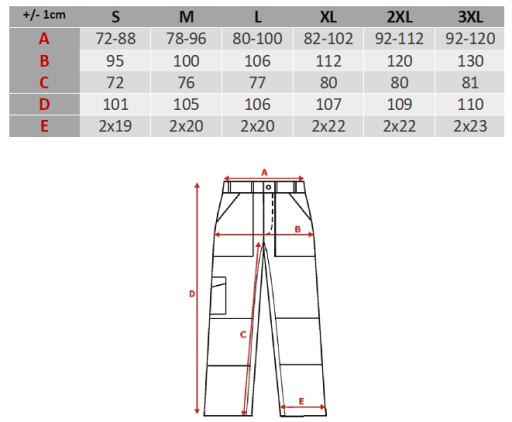 - D - długość zewnętrzna, całkowita spodni