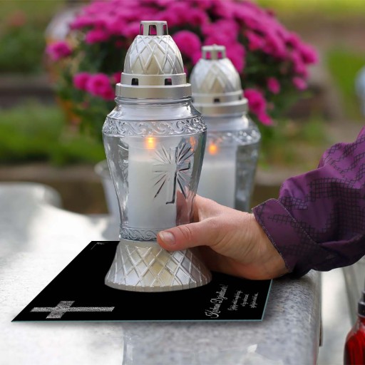 - Trwałość - szklana podstawka pod znicze wykonana jest z certyfikowanego szkła hartowanego, co czyni ją niezwykle odporną na wodę i warunki atmosferyczne.