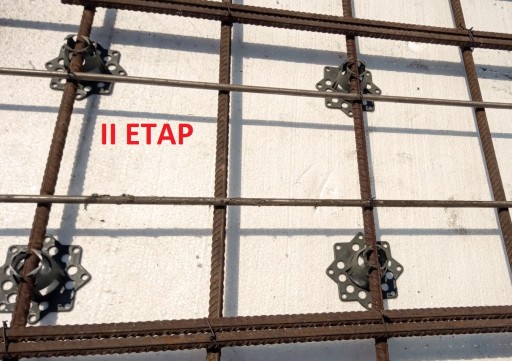 - W drugim etapie podnosząc lekko zbrojenie podkładki opadają pod zbrojenie, dzięki haczykom w gnieździe, gdzie montowany jest pręt zbrojenia