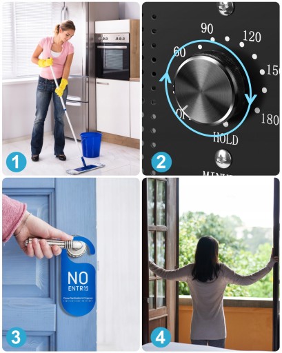 Płynna regulacja w zakresie od 1 do 180 minut umożliwia dostosowanie czasu pracy urządzenia do wielkości pomieszczenia.