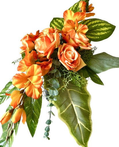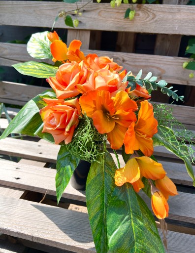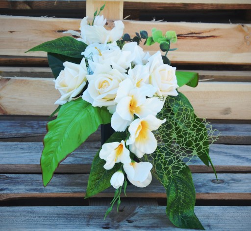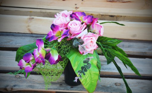 Bukiet jest piękny, jak żywa kompozycja, ale pozostanie na grobie o wiele dłużej, niż kwiaty cięte. W ofercie kilka opcji kolorystycznych bukietów.