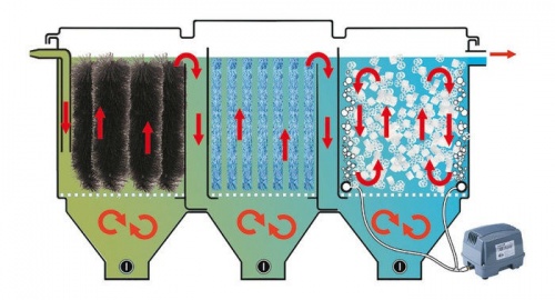 Zasada działania filtra polega na przepływie wody ze stawu przez kolejne komory, trafiając zawsze najpierw do odstojnika, w którym wytrącają się większe zanieczyszcznia. Z odstojników woda płynie ku górze przechodząc przez kolejne warstwy filtracyjne.