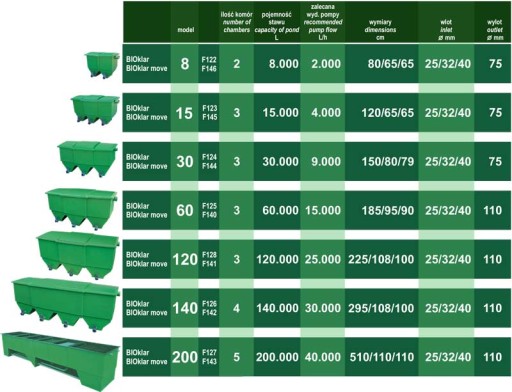 - Modele 30, 60, 120 i 140 dostępne są w standardzie zarówno w wersji pompowej jak i grawitacyjnej. Obie wersje mają wlot w dolnej części filtra, wprost do pierwszej komory sedymentacyjnej.