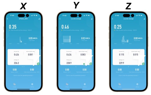 - Ochrona przed kradzieżą energii - podgląd w czasie rzeczywistym pozwala sprawdzić aktualne zużycie dla każdej z faz.