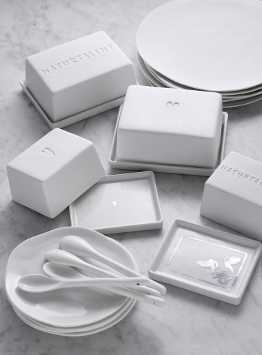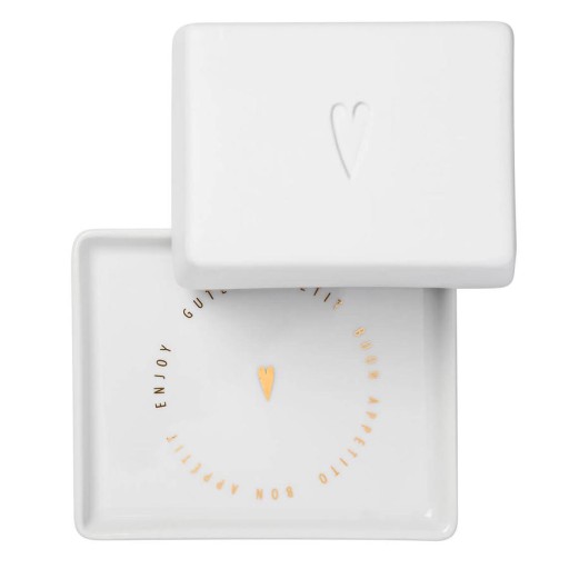 Maselniczka Rader jest częścią kolekcji Good Day, dlatego na pokrywce znajduje się charakterystyczne dla tej serii tłoczone serduszko, a na podstawce ten sam kształt malowany na złoto oraz napis.