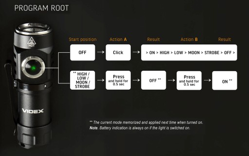 - aby włączyć latarkę, użytkownik powinien krótko nacisnąć przycisk. Kolejne krótkie naciśnięcia przycisku umożliwiają zmianę trybów światła (HIGH, LOW, STROBE)