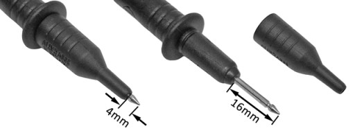 Miernik posiada przewody pomiarowe zakończone szpilkami pomiarowymi. Szpilki posiadają nakładane nasadki ograniczające długość odizolowanej końcówki.