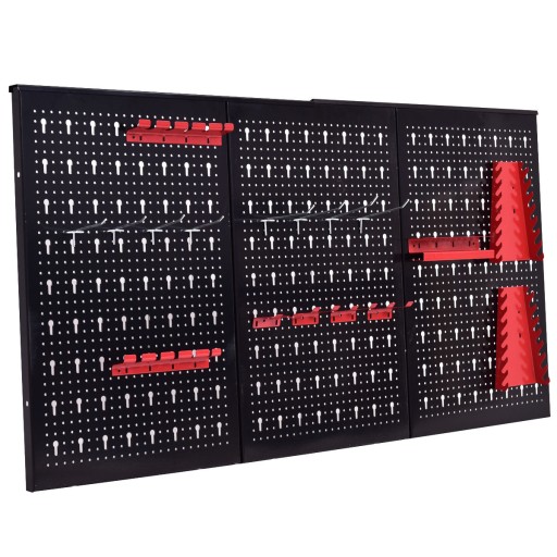 Dużo miejsca do przechowywania - zestaw składa się aż z 20 elementów. Znajdziesz w nim 3 panele tablicy narzędziowej oraz różnego rodzaju haki i organizery na narzędzia, które zapewniają dużo miejsca do przechowywania