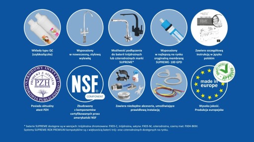 Filtry odwróconej osmozy Supreme Premium to gotowe zestawy, które zawierają wszystkie niezbędne do jego montażu elementy, w których skład wchodzi: