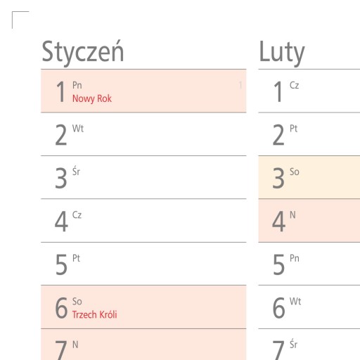 - zaznaczone dni wolne od pracy, święta państwowe i kościelne oraz zwyczajowe święta m.in. Dzień Babci i Dziadka, Dzień Kobiet, Dzień Matki, Dzień Dziecka.