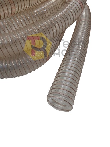 Wąż wykonany z odpornego na ścieranie poliuretanu poliestrowego, posiada wzmocnienie w postaci spirali z pomiedziowanego drutu ze stali lanej sprężynowej osadzonej w ściance.