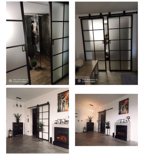 Drzwi Przesuwne w ramie aluminiowej wraz z systemem przesuwnym. Wypełnienie szkło typu Satyna czyli szkło MLECZNE (błysk z jednej strony, półmat z drugiej) z czarnymi aplikacjami z dwóch stron.