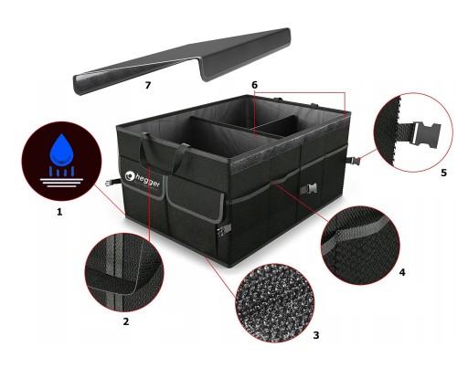 Torba podzielona na części, można przechowywać wszystkie przedmioty nawet bardzo ciężkie i z ostrymi krawędziami np. gaśnica, apteczka, trójkąt ostrzegawczy, olej, płyn do spryskiwaczy, zapasowe żarówki, klucze, linka holownicza, kable rozruchowe itp. Wyposażona w uchwyty do przenoszenia.