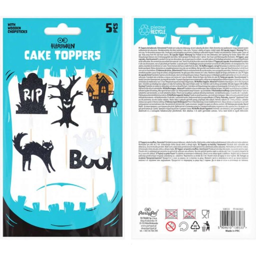 Zestaw pięciu papierowych pikerów. Przedstawiają one charakterystyczne elementy kojarzące się z Halloween takie jak nagrobek, straszne drzewo, czarny kot, upiorna posiadłość i straszący duch. Doskonale ozdobią one różnego rodzaju słodkie, jak i słone przekąski. Ich widok z pewnością zachwyci gości i z jeszcze większą chęcią zjedzą oni twoje wypieki.