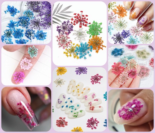 - Zdobienia z suszonymi kwiatkami można ułożyć w dowolny sposób - pojedyncze kwiatki na każdym paznokciu, subtelny bukiet na jednym paznokciu, czy też delikatne liście i gałązki tworzące cały wzór na każdym paznokciu.