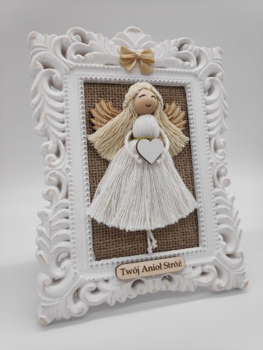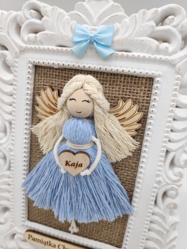 ANIOŁEK MAKRAMA W RAMCE PAMIĄTKA CHRZTU ŚWIĘTEGO PREZENT URODZINY METRYCZKA