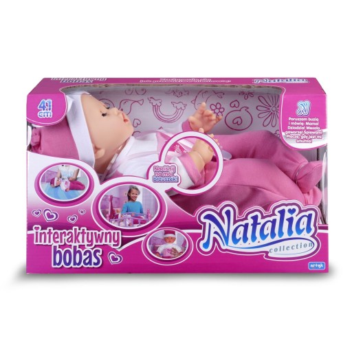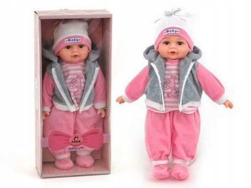 Lalka 35cm z polskim dźwiękiem, mówi i śpiewa po polsku. Bobas ubrany jest w szarą kamizelkę z kapturem i aplikacją truskawki, różową czapkę i skarpetki w paski, różowe spodnie, bluzę w paski. Lalka w zestawie z różowym smoczkiem.