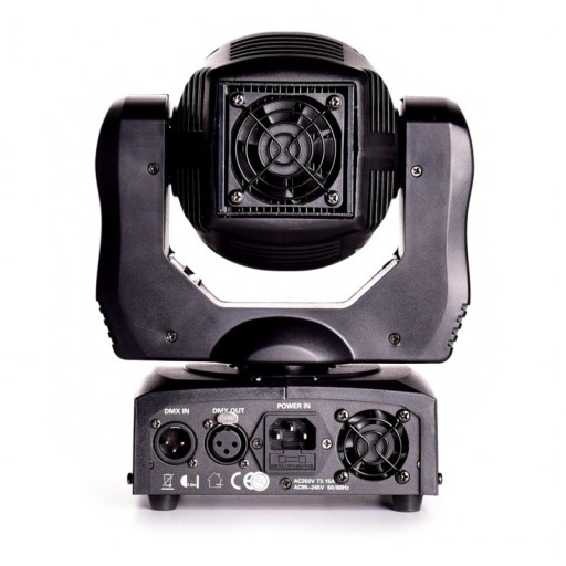 W tylnej części podstawy głowicy LED znajduje się gniazdo zasilania oraz wejście i wyjście do podłączenia przewodów przesyłających sterujące sygnały DMX. W części przedniej mieści się panel sterowania w postaci cyfrowego wyświetlacza oraz czterech przycisków (Menu, Up, Down, Enter). Za ich pomocą możemy wybrać jeden z czterech trybów pracy reflektora: