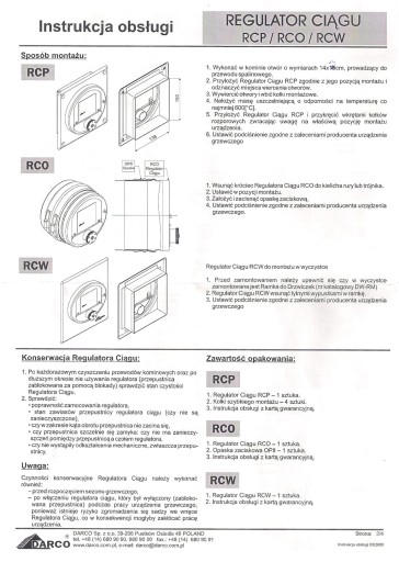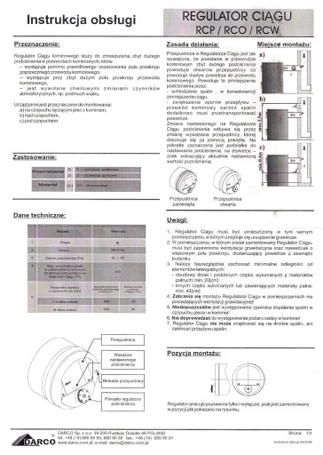 - Max. temperatura spalin w przewodzie kominowym do którego jest podłączony Regulator Ciągu [ºC]: 400