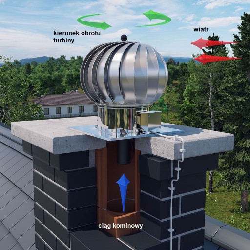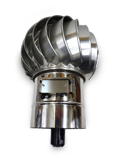Obrotowa nasada kominowa TURBOWENT HYBRYDOWY fi200 jest urządzeniem dynamicznie wykorzystującym siłę wiatru do wspomagania ciągu kominowego, dodatkowo wyposażonym w elektronicznie komutowany silnik bezszczotkowy małej mocy do jego skutecznej stabilizacji. Montuje się ją na wylotach kominów wentylacyjnych o działaniu grawitacyjnym. Niezależnie od kierunku, siły i rodzaju wiatru, turbina nasady obraca się zawsze w jedną i tę samą stronę wytwarzając podciśnienie w króćcu dolotowym nasady, co w efekcie powoduje wzrost natężenia przepływu powietrza w przewodach.