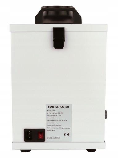 Pochłaniacz oparów JH100 posiada trzystopniowy system oczyszczania: wstępny, HEPA oraz główny aktywny węglowy – szybko i precyzyjnie usuwający z powietrza trujące substancje. Wysokiej klasy filtry charakteryzują się znacznie lepszą wydajnością oraz dokładnością w wyłapywaniu drobnych cząsteczek oparów niż w wypadku zastosowania jedynie filtra węglowego.
