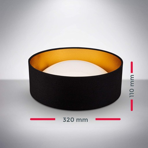 Lampa sufitowa - plafon wykonany z metalu oraz tkaniny. Źródłem światła jest klosz który daje efekt rozgwieżdżonego nieba, które jest otoczone kloszem z tkaniny z teksturowaną złotą folią od wewnątrz i pokrytym od zewnątrz cienką czarną tkaniną z subtelnym efektem brokatu