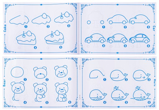 Zestaw zawiera również obrazkową instrukcję jak krok po kroku namalować misia, autko lub jeszcze kilka innych obrazków. Instrukcję można wykorzystać jako inspirację a gdy dziecko zapozna się z wszystkimi wzorami z pewnością przystąpi do nowych, własnych projektów i rysunków :)