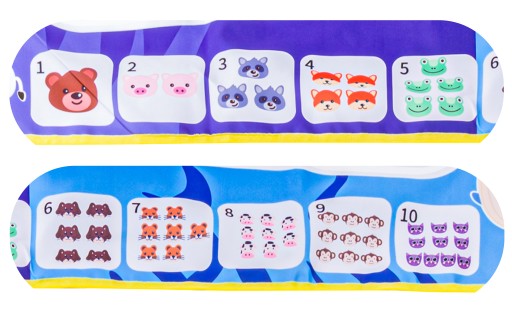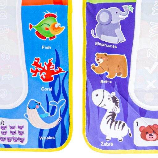 Może służyć do nauki kolorów, zwierząt i ich nazw po angielsku oraz do nauki matematyki. U dołu maty znajdziemy zbiory, w których znajdują się zwierzaki w ilościach odpowiadających odpowiednim cyferkom. Na samej macie również ukryte są kształty, figury geometryczne oraz litery alfabetu, które staną się wyraźne dopiero po zamalowaniu wodą. Spód maty jest wodoodporny.