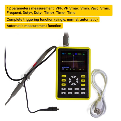 - Do 12 parametrów pomiarowych: napięcie VPP, VP, Vmax, Vmin, Vavg, Vrms, częstotliwość, Duty +, Duty-, Time +, Time-, Time.