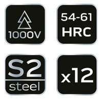 Dzięki zastosowaniu stali stopowej S2 twardość końcówek wynosi 60 HRC, co wydatnie poprawia trwałość i jakość ich pracy.