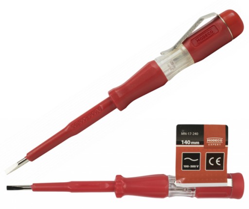 Poręczny próbnik / tester wyposażony w diodę, umożliwiający sprawdzenie napięcia w sieci elektrycznej w zakresie 100-250 V. Zawieszka PCV umożliwia wyeksponowanie produktu na haku regałowym.