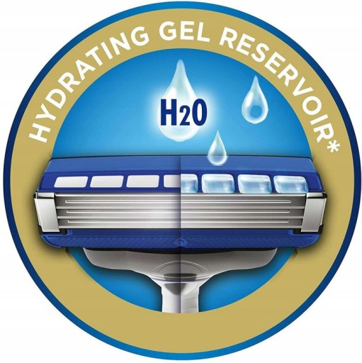 - Pojemnik z żelem nawilżającym z technologią autouzupełniania żelu aktywowany za pomocą wody (zamiast zwykłego paska nawilżającego): Zaprojektowany po to, by chronić męską skórę przed podrażnieniami i nawilżać ją w trakcie golenia. Nawilżenie utrzymuje się nawet do 1h po goleniu!