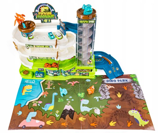 Garaż pomieści całkiem sporą ilość samochodzików. Na najwyższy poziom dostaniemy się windą, którą możemy sterować ręcznie przekręcając dinozaura na szczycie windy. Ale jeśli posiadamy baterie to po uruchomieniu podnośnik zacznie się obracać i nasze autko "samo" - bez naszej dodatkowej pomocy dostanie się na szczyt garażu. Uruchomionej windzie towarzyszy wesoła melodia oraz efekty świetlne.