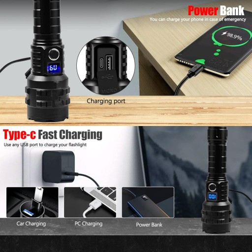 ✅ Latarka poprzez port USB-C, może być ładowana przez ładowarkę samochodową, komputer, powerbank, ładowarkę ścienną USB itp.