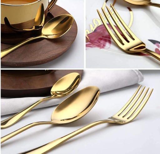 24-częściowy złoty zestaw sztućców składa się z 6 noży, 6 łyżek stołowych, 6 obiadowych i 6 łyżeczek, dzięki czemu będzie dobrym wyborem dla każdej rodziny.