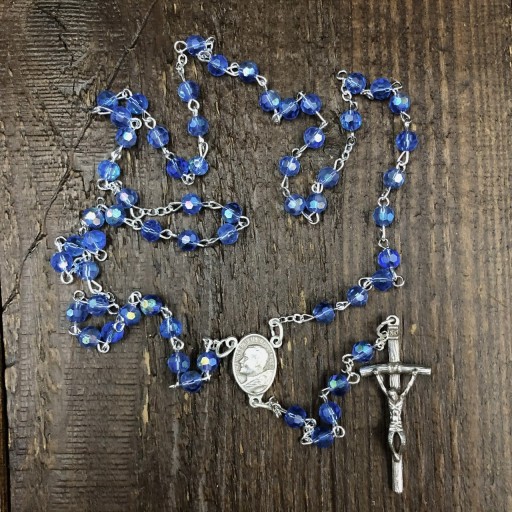 Różaniec wykonany z kryształowych paciorków połączonych łańcuszkiem ze stali nierdzewnej. Łącznik z jednej strony z Matka Bożą Częstochowską, z drugiej Jan Paweł II.