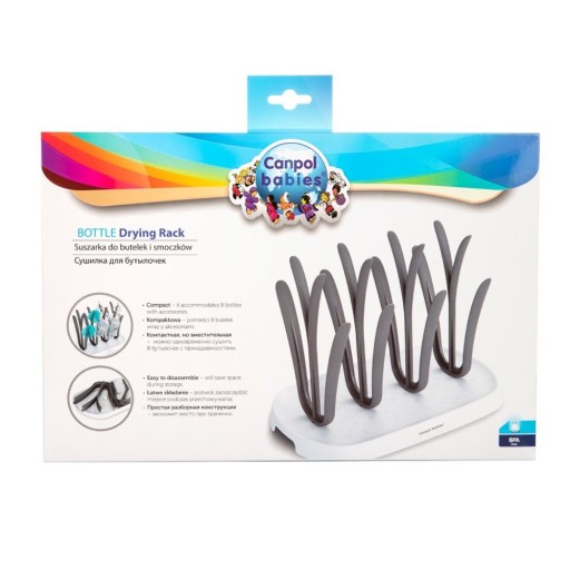 Suszarka Canpol babies została zaprojektowana tak, by pomieścić aż 8 butelek wraz z akcesoriami. Dzięki ruchomym widełkom, łatwo się składa i zajmuje niewiele miejsca. Jest też lekka, poręczna i łatwa do utrzymania w czystości.