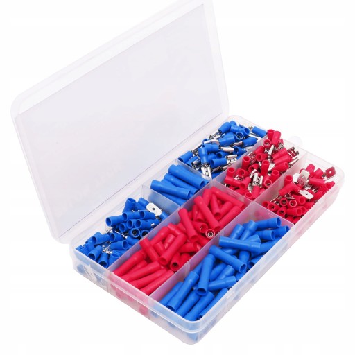 Izolowane konektory zaciskane dostarczone w wygodnym solidnym opakowaniu ułatwiającym segregację na poszczególne rodzaje konektorów.