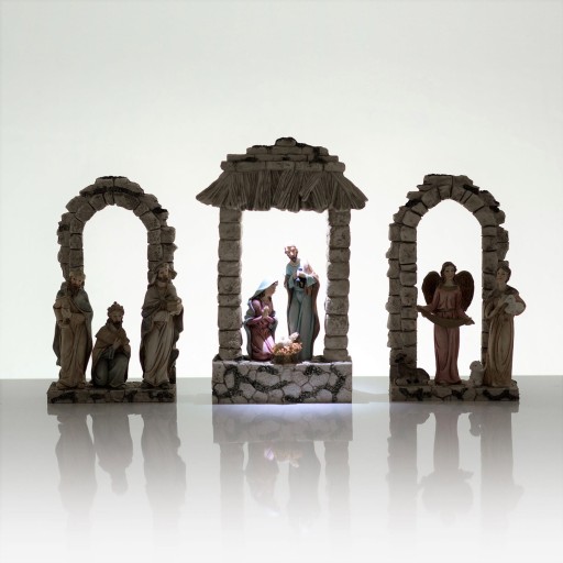 Nowoczesna, ręcznie malowana szopka bożonarodzeniowa to zarówno ponadczasowa świąteczna dekoracja, jak również doskonały pomysł na prezent dla bliskiej osoby. Stajenka składa się z trzech elementów. Na jednym z nich znajdują się Trzej Królowie, na kolejnej Święta Rodzina, a na ostatniej ulokowany jest anioł wraz z pastuszkiem. Światełko LED podświetla postacie Świętej Rodziny, dodając szopce świątecznego klimatu.