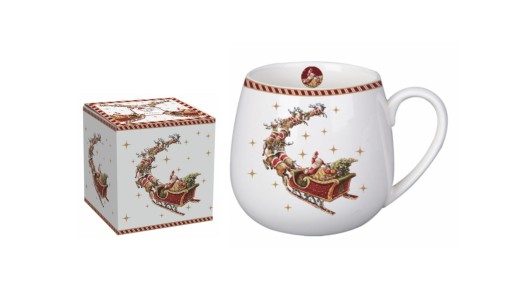 Kubek baryłka 430 ml SANTA ON SLEIGH wchodzący w skład serii Świątecznej, wykonany z porcelany New Bone China, charakteryzującej się elegancką i naturalną kremowo - białą barwą z delikatnym połyskiem, a także wyjątkową wytrzymałością.