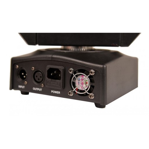 Urządzenie wyposażone zostało w mocną, 60-watową diodę. Światło rozpraszane jest pod stałym kątem 5°. Głowa led posiada tarczę, na której znajduje się 7 filtrów barwiących wiązkę żywymi, nasyconymi kolorami. W tylnej części podstawy znajduje się gniazdo zasilania oraz wejście i wyjście typu XLR umożliwiające kontrolowanie reflektora LED za pomocą protokołu DMX. Dużym atutem tego beam’a jest bardzo cicha praca. Urządzenie zostało wyposażone w efektywny wentylator automatycznie załączający się w momencie podwyższonej temperatury. Z przodu usytuowany został panel sterowania w postaci cyfrowego wyświetlacza oraz czterech przycisków. Za ich pomocą możemy wybrać jeden z trybów pracy urządzenia: