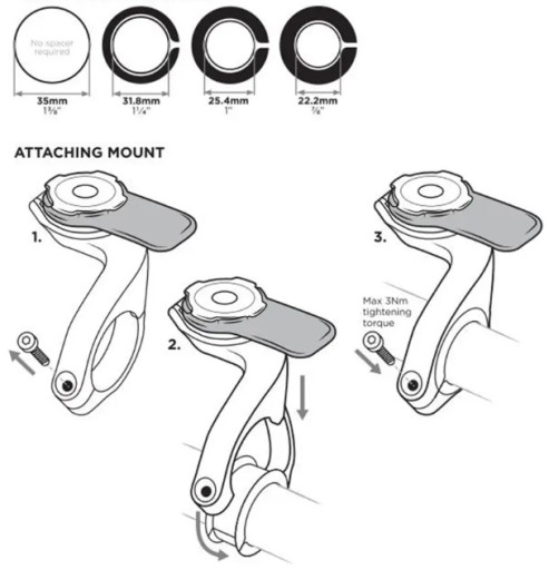 - uchwyt montowany na kierownicy o średnicy 35 mm, 31,8 mm, 25,4 mm i 22 mm