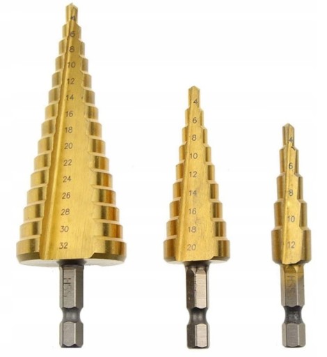 WIERTŁA 3 SZTUKI STOŻKOWE STOPNIOWE DO METALU ZESTAW WIERTEŁ 3EL HEX 4-32MM