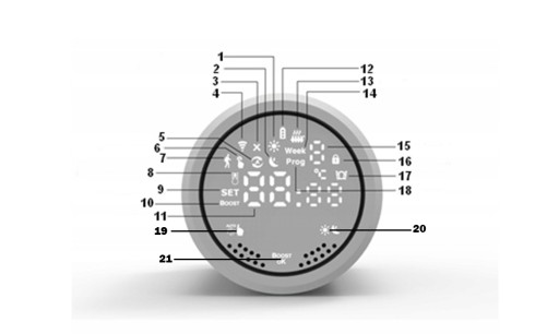 20. -KRÓTKIE NAĆIŚNIĘCIE, ABY PRZEŁĄCZYĆ MIĘDZY TRYBEM KOMFORTU A TRYBEM OSZCZĘDZANIA ENERGII