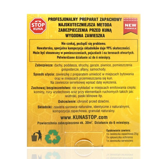 Specjalna kompozycja zapachowa, odstrasza kuny. Działa natychmiast.
